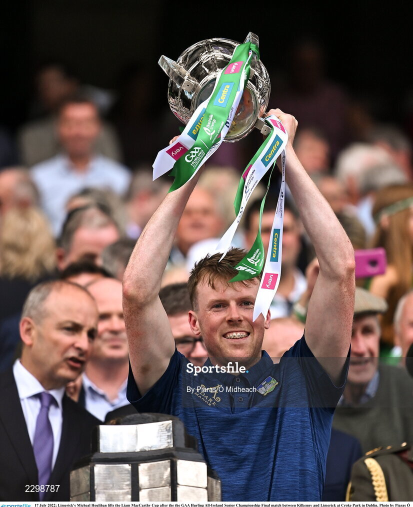17 July 2022; Limerick's Micheal Houlihan lifts the Liam MacCarthy Cup after the the GAA Hurling All-Ireland Senior Championship Final match between Kilkenny and Limerick at Croke Park in Dublin. Photo by Piaras Ó Mídheach/Sportsfile