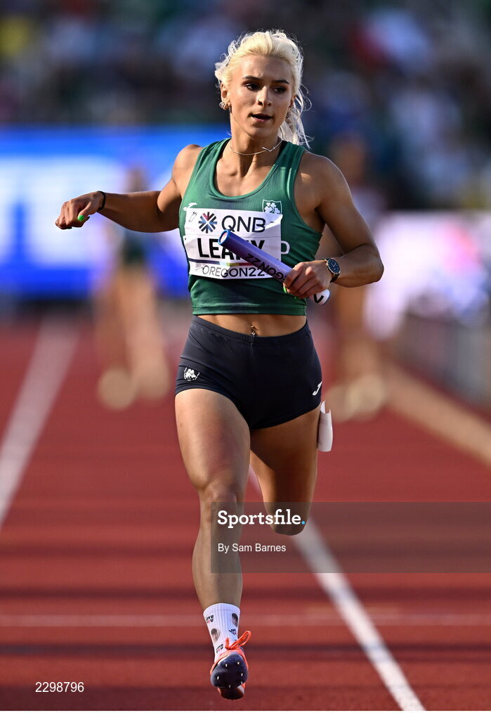 22 July 2022; Sarah Leahy of Ireland during the women's 4x100m relay during day eight of the World Athletics Championships at Hayward Field in Eugene, Oregon, USA. Photo by Sam Barnes/Sportsfile