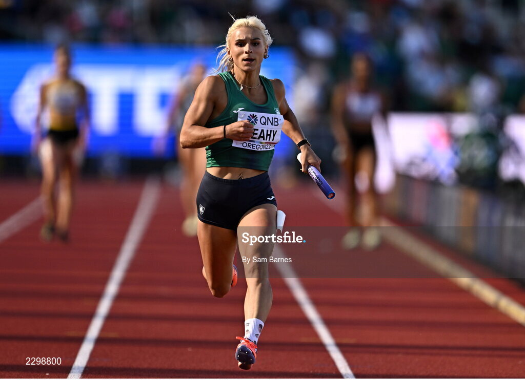 22 July 2022; Sarah Leahy of Ireland during the women's 4x100m relay during day eight of the World Athletics Championships at Hayward Field in Eugene, Oregon, USA. Photo by Sam Barnes/Sportsfile