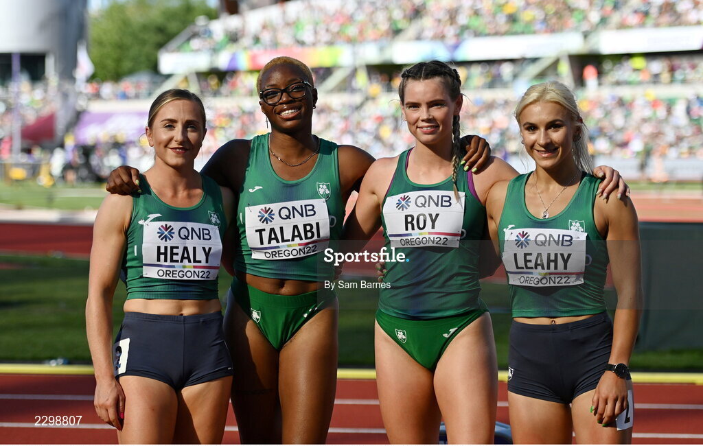 22 July 2022; Joan Healy, left, with, from left to right, Adeyemi Talabi, Lauren Roy and Sarah Leahy of Ireland after the women's 4x100m relay during day eight of the World Athletics Championships at Hayward Field in Eugene, Oregon, USA. Photo by Sam Barnes/Sportsfile