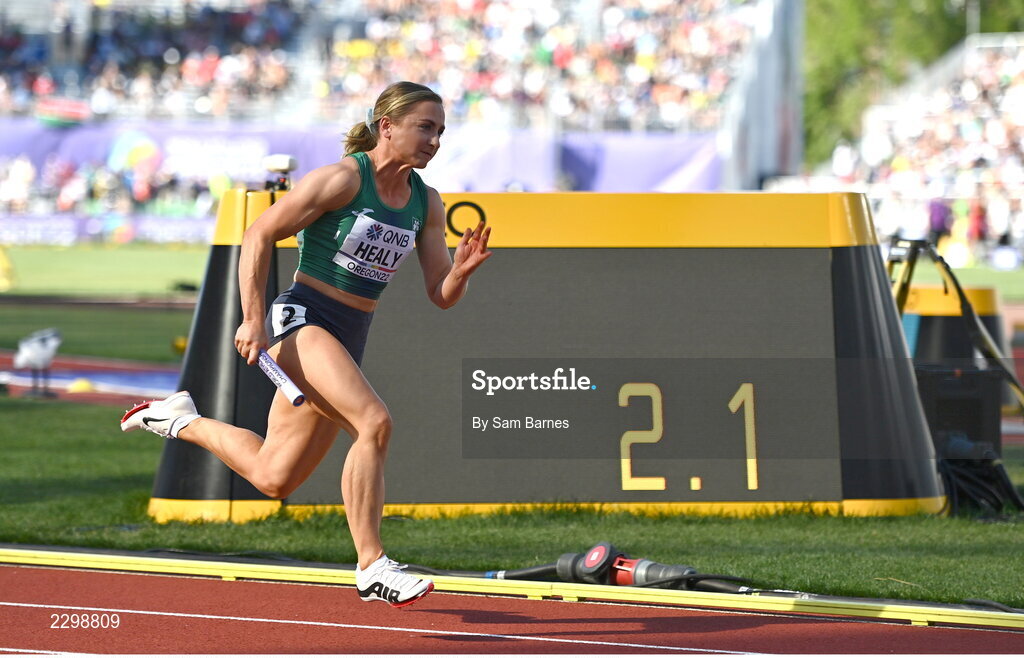 22 July 2022; Joan Healy of Ireland during the women's 4x100m relay during day eight of the World Athletics Championships at Hayward Field in Eugene, Oregon, USA. Photo by Sam Barnes/Sportsfile