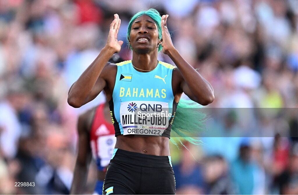 22 July 2022; Shaunae Miller-Uibo of Bahamas after winning the women's 400m final during day eight of the World Athletics Championships at Hayward Field in Eugene, Oregon, USA. Photo by Sam Barnes/Sportsfile