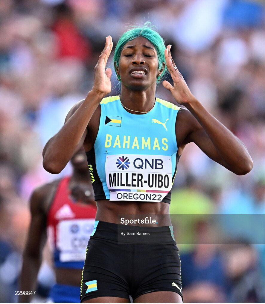 22 July 2022; Shaunae Miller-Uibo of Bahamas after winning the women's 400m final during day eight of the World Athletics Championships at Hayward Field in Eugene, Oregon, USA. Photo by Sam Barnes/Sportsfile