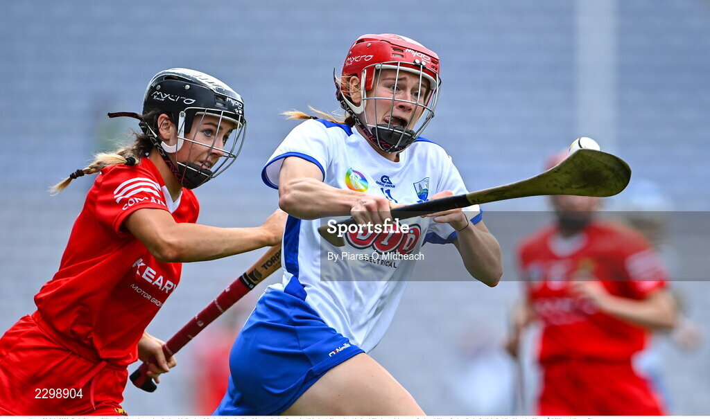 23 July 2022; Beth Carton of Waterford in action against Saoirse McCarthy of Cork during the Glen Dimplex Senior Camogie All-Ireland Championship Semi-Final match between Cork and Waterford at Croke Park in Dublin. Photo by Piaras Ó Mídheach/Sportsfile