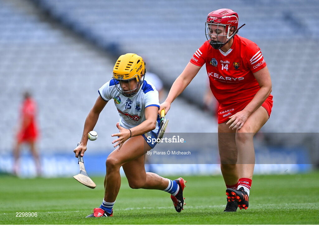 23 July 2022; Niamh Rockett of Waterford in action against Chloe Sigerson of Cork during the Glen Dimplex Senior Camogie All-Ireland Championship Semi-Final match between Cork and Waterford at Croke Park in Dublin. Photo by Piaras Ó Mídheach/Sportsfile