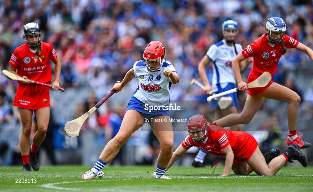 23 July 2022; Róisín Kirwan of Waterford gets away from Libby Coppinger of Cork during the Glen Dimplex Senior Camogie All-Ireland Championship Semi-Final match between Cork and Waterford at Croke Park in Dublin. Photo by Piaras Ó Mídheach/Sportsfile