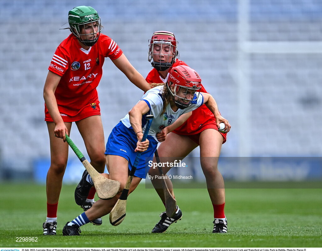 23 July 2022; Lorraine Bray of Waterford in action against Katie Mahoney, left, and Meabh Murphy of Cork during the Glen Dimplex Senior Camogie All-Ireland Championship Semi-Final match between Cork and Waterford at Croke Park in Dublin. Photo by Piaras Ó Mídheach/Sportsfile