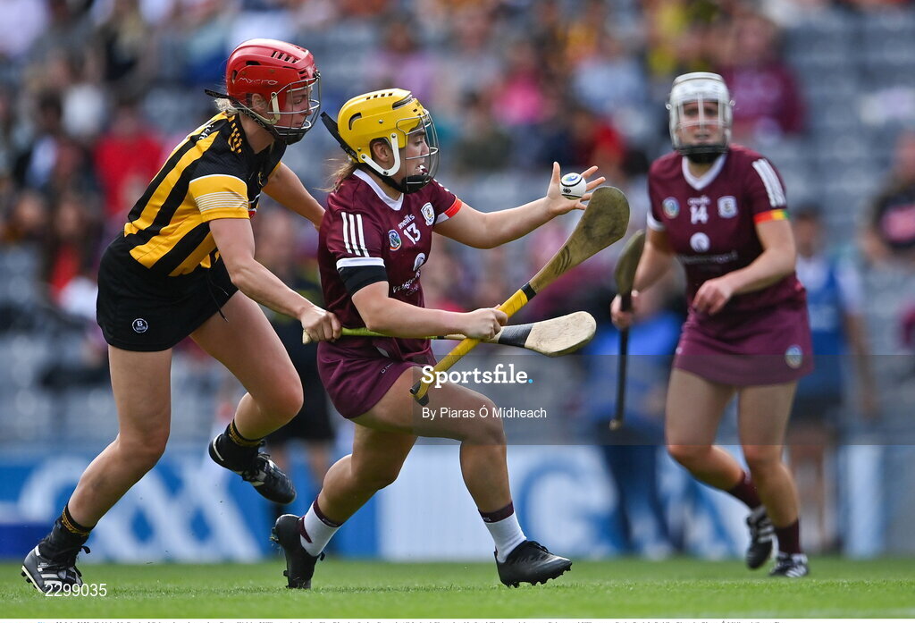 23 July 2022; Siobhán McGrath of Galway in action against Grace Walsh of Kilkenny during the Glen Dimplex Senior Camogie All-Ireland Championship Semi-Final match between Galway and Kilkenny at Croke Park in Dublin. Photo by Piaras Ó Mídheach/Sportsfile