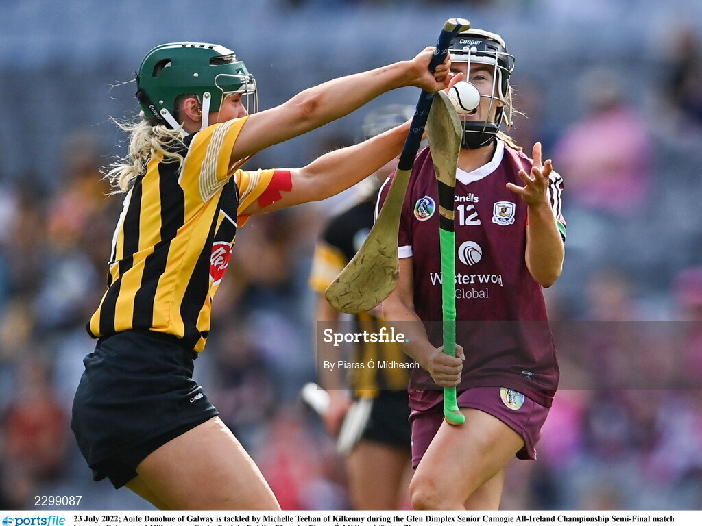23 July 2022; Aoife Donohue of Galway is tackled by Michelle Teehan of Kilkenny during the Glen Dimplex Senior Camogie All-Ireland Championship Semi-Final match between Galway and Kilkenny at Croke Park in Dublin. Photo by Piaras Ó Mídheach/Sportsfile