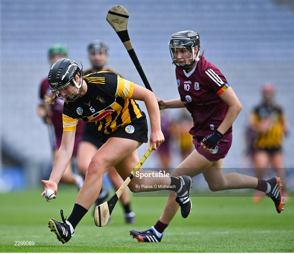 23 July 2022; Tiffany Fitzgerald of Kilkenny in action against Carrie Dolan of Galway during the Glen Dimplex Senior Camogie All-Ireland Championship Semi-Final match between Galway and Kilkenny at Croke Park in Dublin. Photo by Piaras Ó Mídheach/Sportsfile