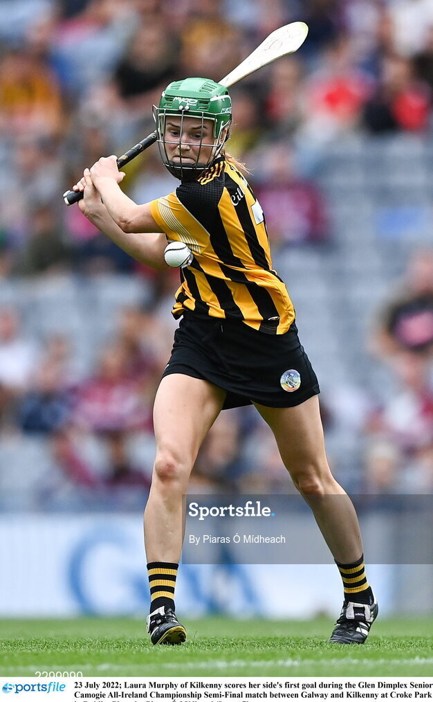 23 July 2022; Laura Murphy of Kilkenny scores her side's first goal during the Glen Dimplex Senior Camogie All-Ireland Championship Semi-Final match between Galway and Kilkenny at Croke Park in Dublin. Photo by Piaras Ó Mídheach/Sportsfile