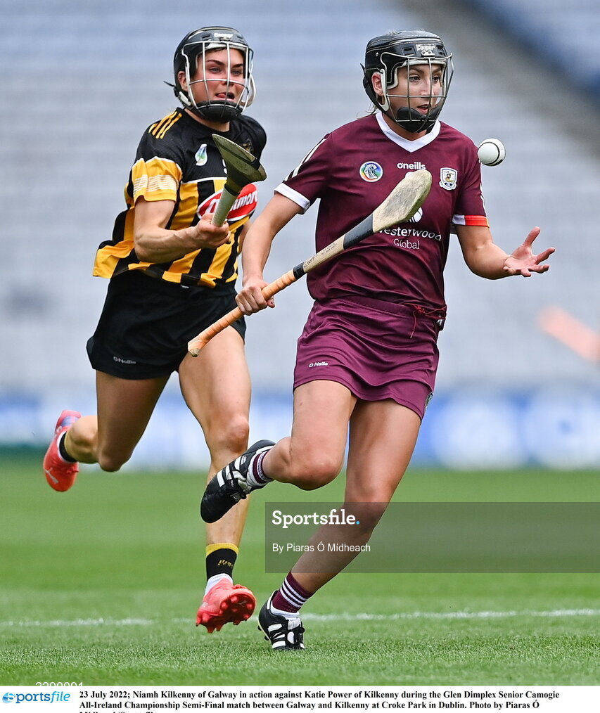 23 July 2022; Niamh Kilkenny of Galway in action against Katie Power of Kilkenny during the Glen Dimplex Senior Camogie All-Ireland Championship Semi-Final match between Galway and Kilkenny at Croke Park in Dublin. Photo by Piaras Ó Mídheach/Sportsfile