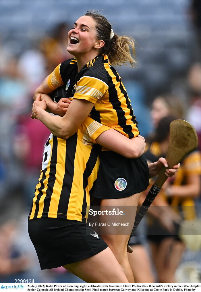 23 July 2022; Katie Power of Kilkenny, right, celebrates with teammate Claire Phelan after their side's victory in the Glen Dimplex Senior Camogie All-Ireland Championship Semi-Final match between Galway and Kilkenny at Croke Park in Dublin. Photo by Piaras Ó Mídheach/Sportsfile