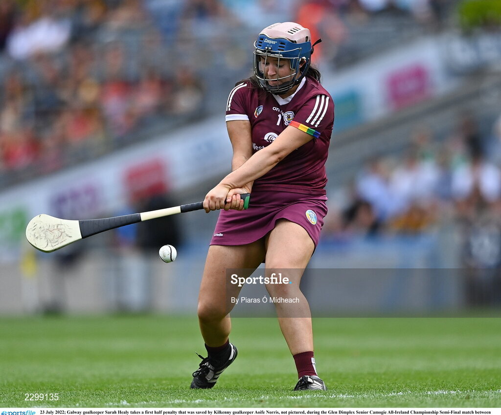23 July 2022; Galway goalkeeper Sarah Healy takes a first half penalty that was saved by Kilkenny goalkeeper Aoife Norris, not pictured, during the Glen Dimplex Senior Camogie All-Ireland Championship Semi-Final match between Galway and Kilkenny at Croke Park in Dublin. Photo by Piaras Ó Mídheach/Sportsfile
