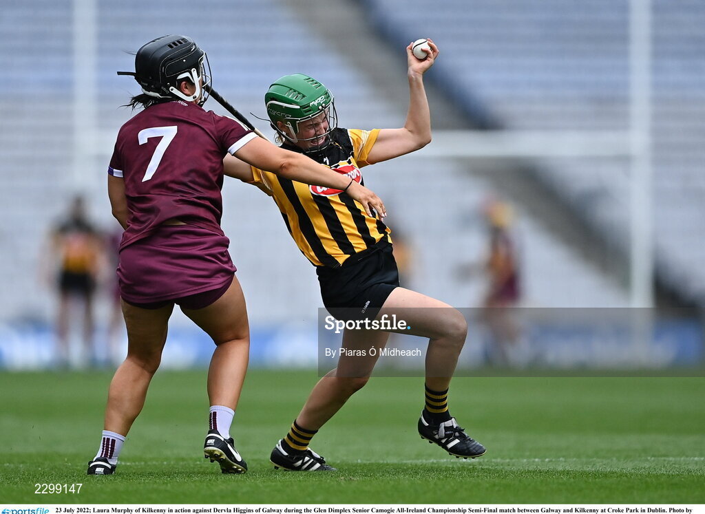 23 July 2022; Laura Murphy of Kilkenny in action against Dervla Higgins of Galway during the Glen Dimplex Senior Camogie All-Ireland Championship Semi-Final match between Galway and Kilkenny at Croke Park in Dublin. Photo by Piaras Ó Mídheach/Sportsfile