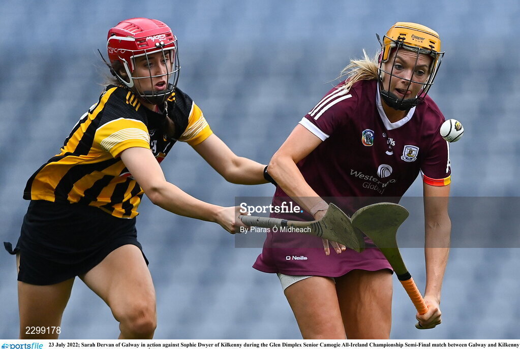 23 July 2022; Sarah Dervan of Galway in action against Sophie Dwyer of Kilkenny during the Glen Dimplex Senior Camogie All-Ireland Championship Semi-Final match between Galway and Kilkenny at Croke Park in Dublin. Photo by Piaras Ó Mídheach/Sportsfile