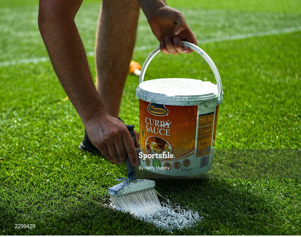 24 July 2022; Deputy head groundsman Colm Daly paints the lines before the GAA Football All-Ireland Senior Championship Final match between Kerry and Galway at Croke Park in Dublin. Photo by Harry Murphy/Sportsfile