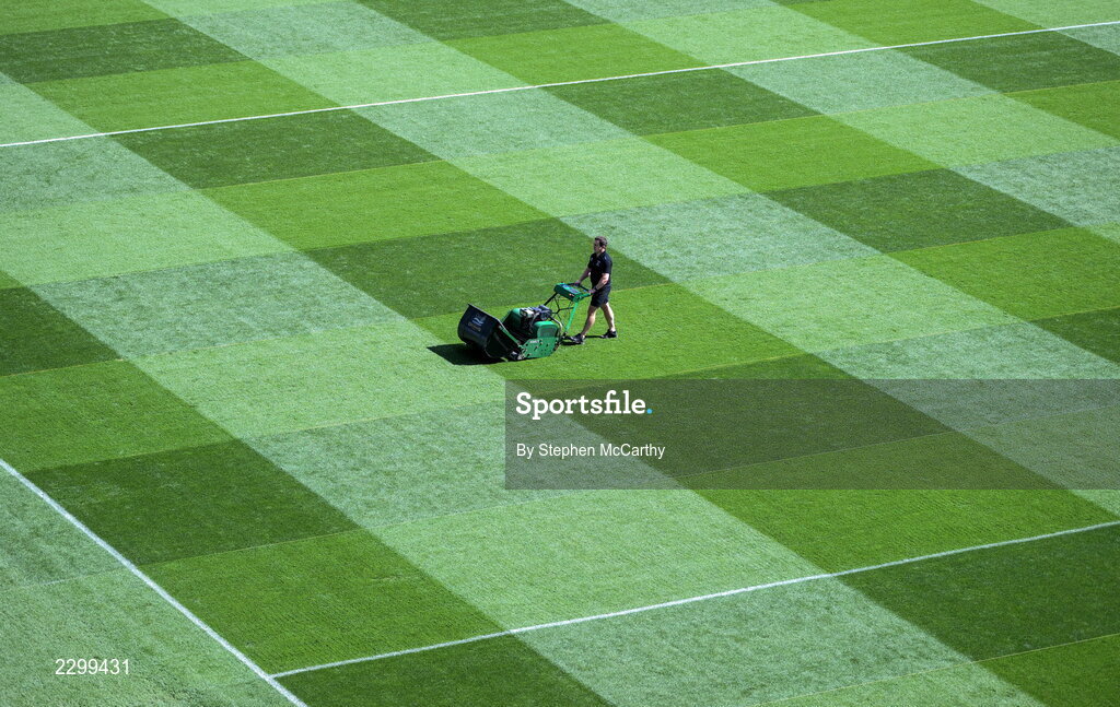 24 July 2022; Deputy head groundsman Colm Daly prepares the pitch before the GAA Football All-Ireland Senior Championship Final match between Kerry and Galway at Croke Park in Dublin. Photo by Stephen McCarthy/Sportsfile