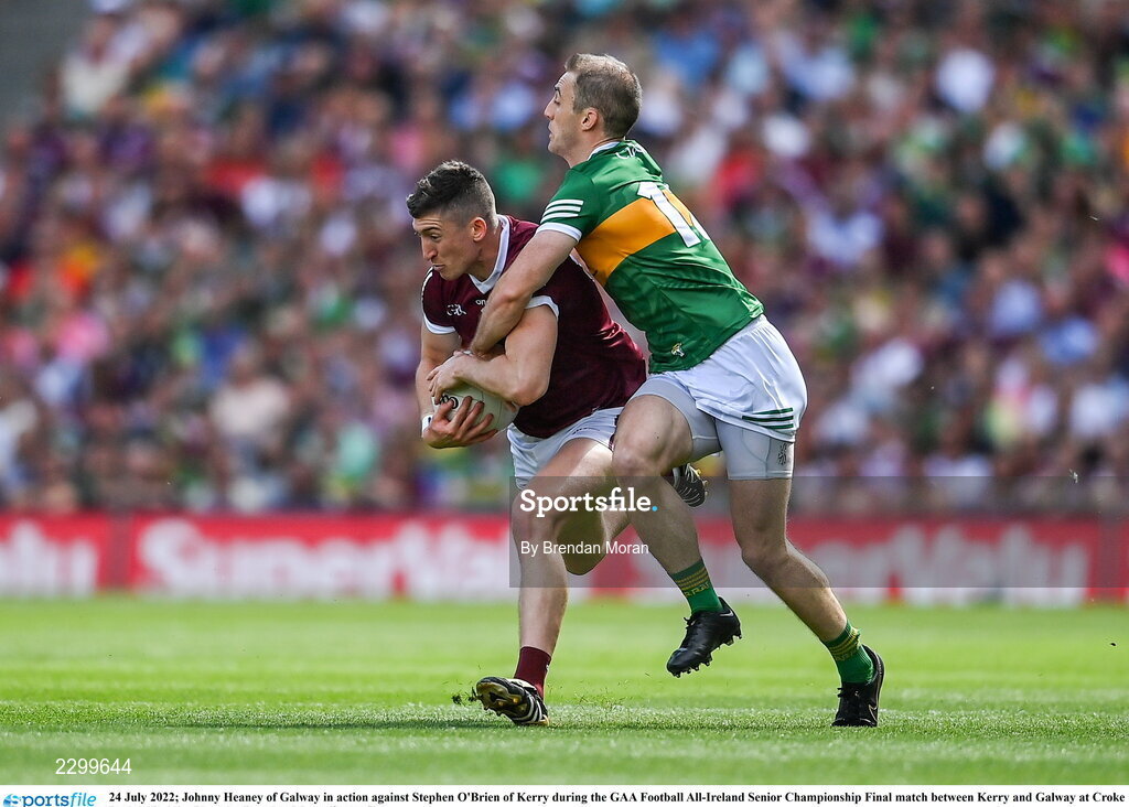 24 July 2022; Johnny Heaney of Galway in action against Stephen O'Brien of Kerry during the GAA Football All-Ireland Senior Championship Final match between Kerry and Galway at Croke Park in Dublin. Photo by Brendan Moran/Sportsfile