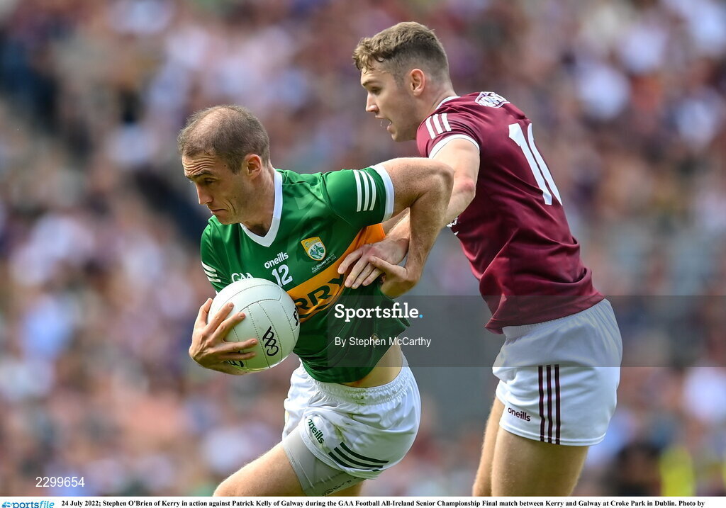 24 July 2022; Stephen O'Brien of Kerry in action against Patrick Kelly of Galway during the GAA Football All-Ireland Senior Championship Final match between Kerry and Galway at Croke Park in Dublin. Photo by Stephen McCarthy/Sportsfile