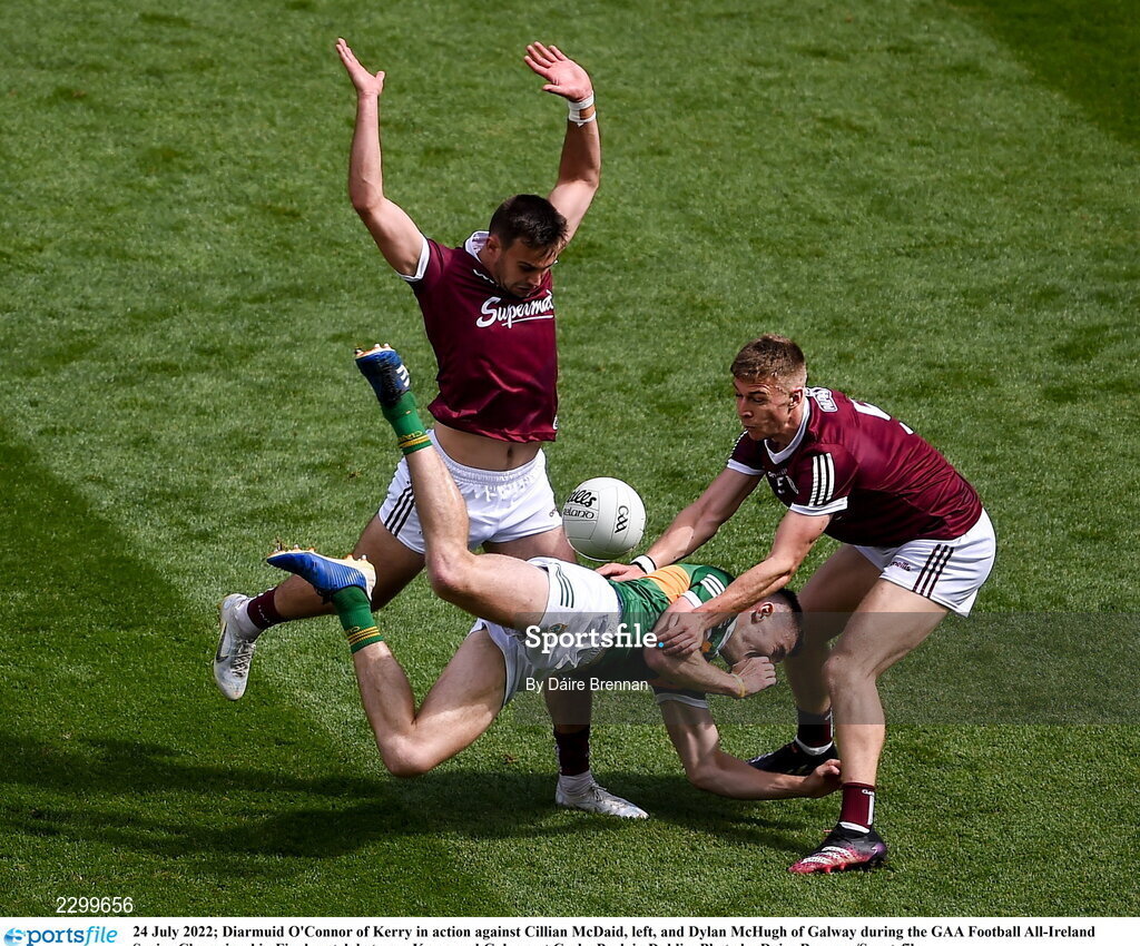24 July 2022; Diarmuid O'Connor of Kerry in action against Cillian McDaid, left, and Dylan McHugh of Galway during the GAA Football All-Ireland Senior Championship Final match between Kerry and Galway at Croke Park in Dublin. Photo by Daire Brennan/Sportsfile