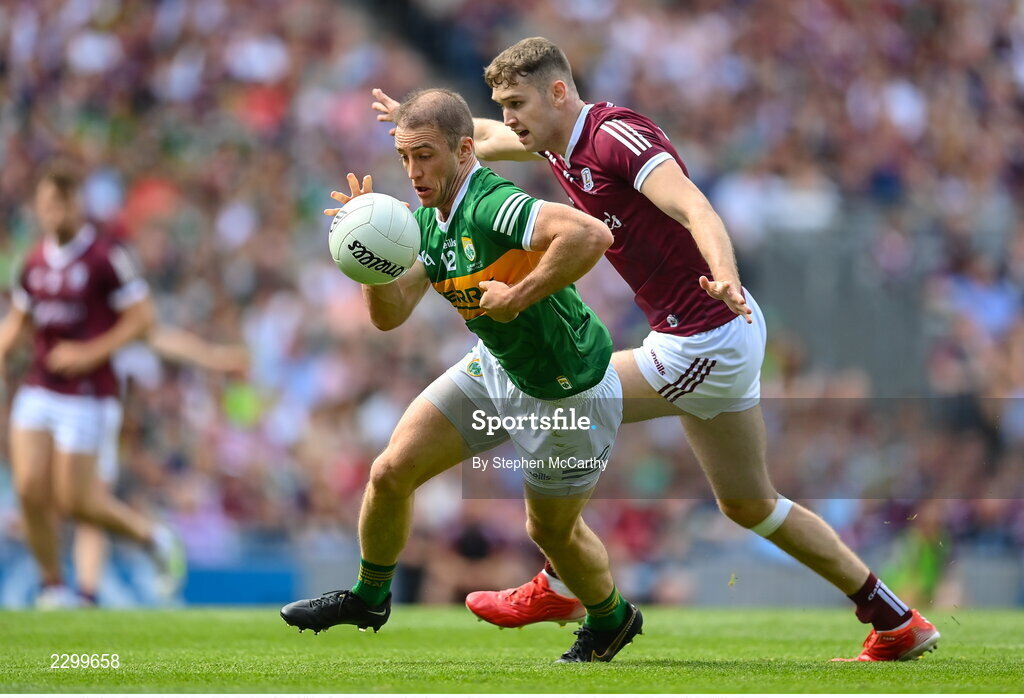 24 July 2022; Stephen O'Brien of Kerry in action against Patrick Kelly of Galway during the GAA Football All-Ireland Senior Championship Final match between Kerry and Galway at Croke Park in Dublin. Photo by Stephen McCarthy/Sportsfile