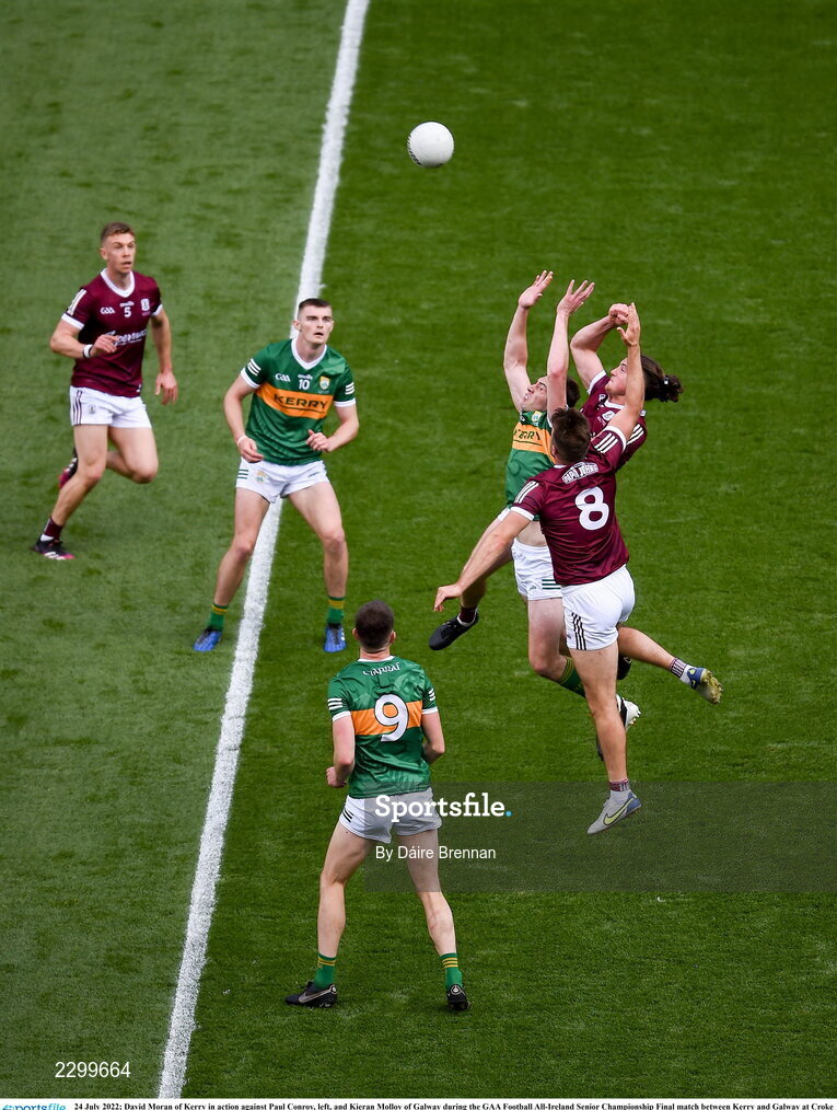 24 July 2022; David Moran of Kerry in action against Paul Conroy, left, and Kieran Molloy of Galway during the GAA Football All-Ireland Senior Championship Final match between Kerry and Galway at Croke Park in Dublin. Photo by Daire Brennan/Sportsfile
