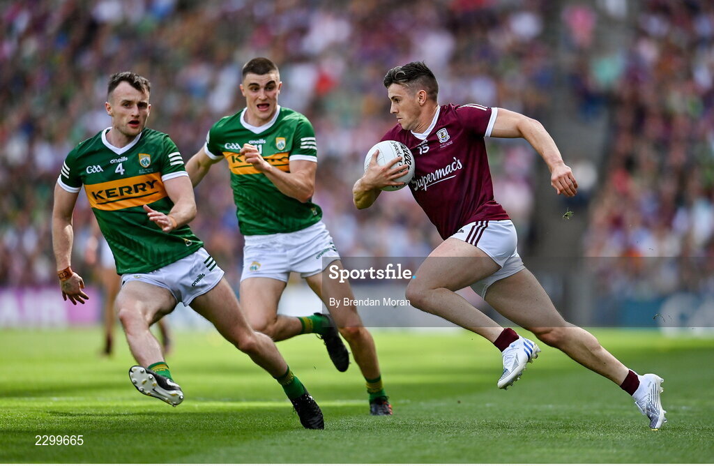 24 July 2022; Shane Walsh of Galway in action against Tom O'Sullivan, left, and Seán O'Shea of Kerry during the GAA Football All-Ireland Senior Championship Final match between Kerry and Galway at Croke Park in Dublin. Photo by Brendan Moran/Sportsfile