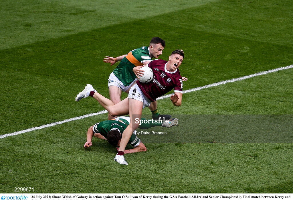 24 July 2022; Shane Walsh of Galway in action against Tom O'Sullivan of Kerry during the GAA Football All-Ireland Senior Championship Final match between Kerry and Galway at Croke Park in Dublin. Photo by Daire Brennan/Sportsfile