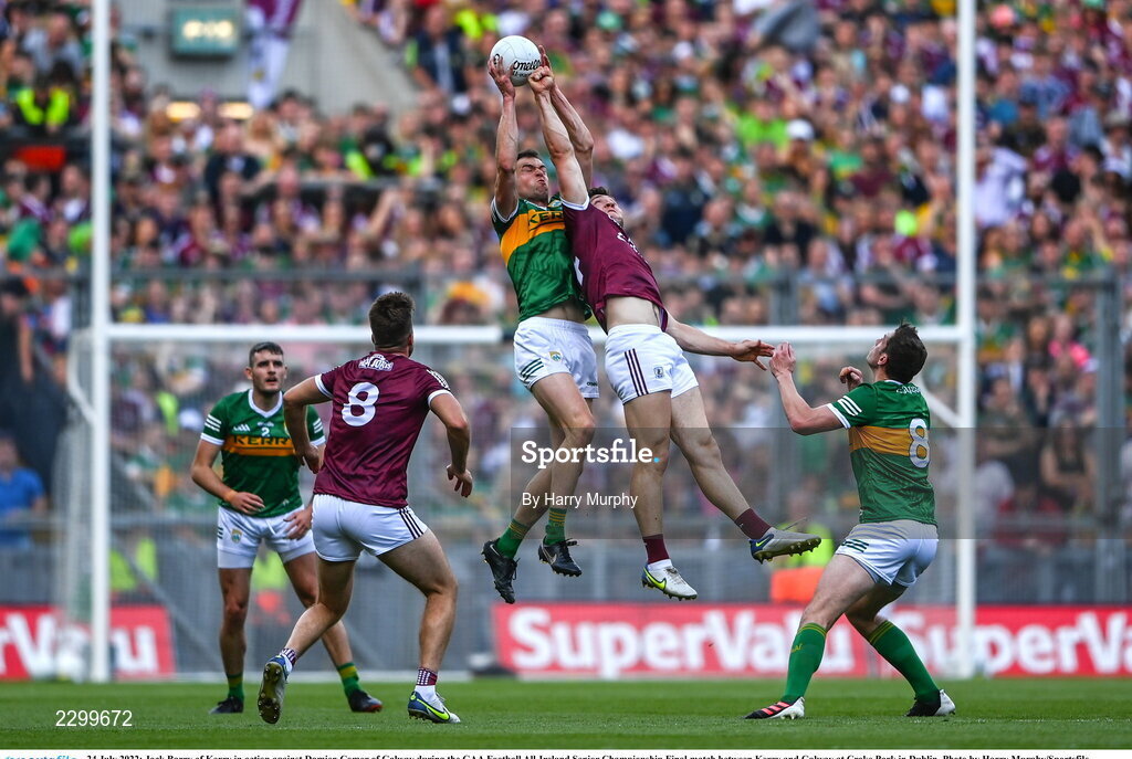 24 July 2022; Jack Barry of Kerry in action against Damien Comer of Galway during the GAA Football All-Ireland Senior Championship Final match between Kerry and Galway at Croke Park in Dublin. Photo by Harry Murphy/Sportsfile
