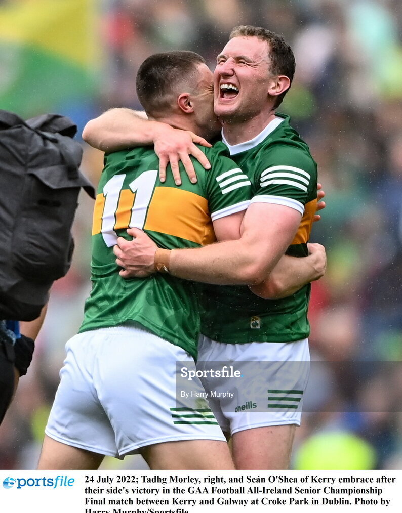 24 July 2022; Tadhg Morley, right, and Seán O'Shea of Kerry embrace after their side's victory in the GAA Football All-Ireland Senior Championship Final match between Kerry and Galway at Croke Park in Dublin. Photo by Harry Murphy/Sportsfile