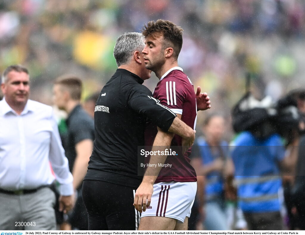 24 July 2022; Paul Conroy of Galway is embraced by Galway manager Padraic Joyce after their side's defeat in the GAA Football All-Ireland Senior Championship Final match between Kerry and Galway at Croke Park in Dublin. Photo by Harry Murphy/Sportsfile