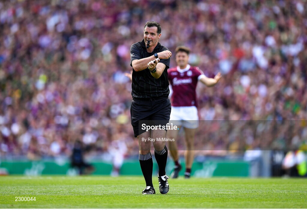 24 July 2022; Referee Sean Hurson explains a decision during the GAA Football All-Ireland Senior Championship Final match between Kerry and Galway at Croke Park in Dublin. Photo by Ray McManus/Sportsfile
