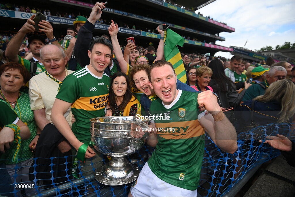 24 July 2022; Tadhg Morley of Kerry and family celebrate with the Sam Maguire Cup after the GAA Football All-Ireland Senior Championship Final match between Kerry and Galway at Croke Park in Dublin. Photo by Stephen McCarthy/Sportsfile