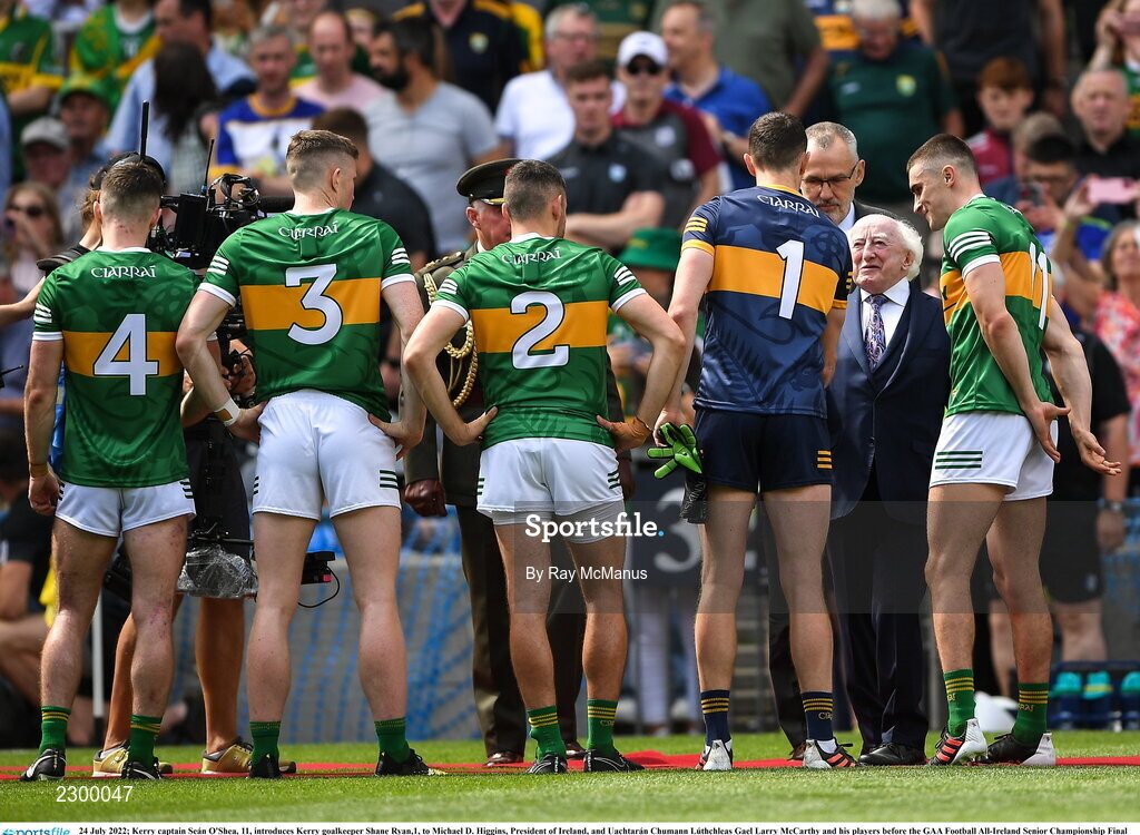 24 July 2022; Kerry captain Seán O'Shea, 11, introduces Kerry goalkeeper Shane Ryan,1, to Michael D. Higgins, President of Ireland, and Uachtarán Chumann Lúthchleas Gael Larry McCarthy and his players before the GAA Football All-Ireland Senior Championship Final match between Kerry and Galway at Croke Park in Dublin.Uachtarán Chumann Lúthchleas Gael Larry McCarthy Photo by Ray McManus/Sportsfile