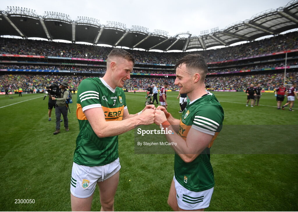 24 July 2022; Jason Foley, left, and Tom O'Sullivan of Kerry celebrate after the GAA Football All-Ireland Senior Championship Final match between Kerry and Galway at Croke Park in Dublin. Photo by Stephen McCarthy/Sportsfile