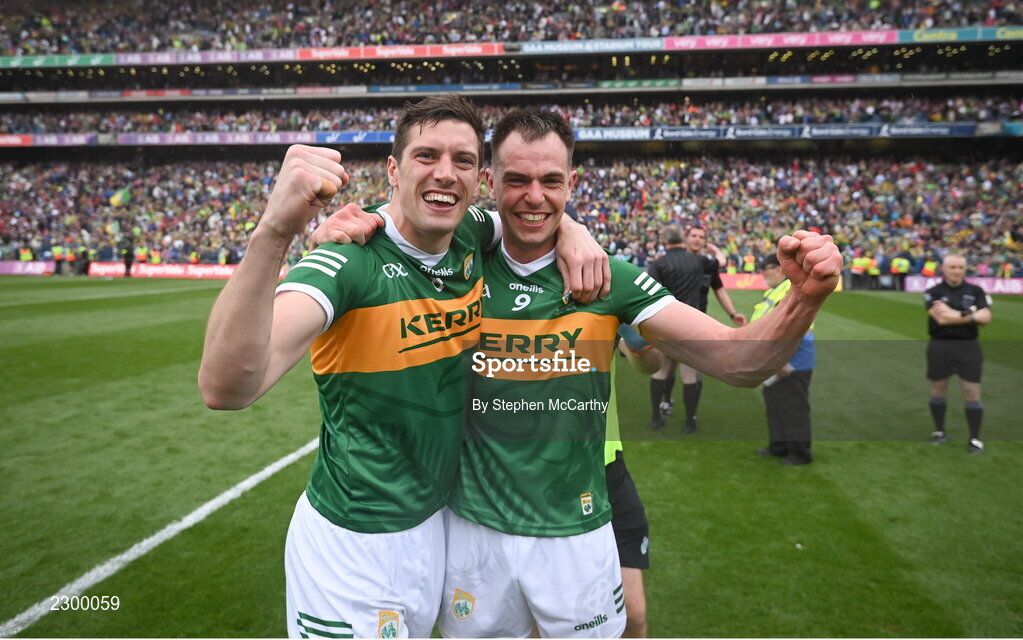 24 July 2022; David Moran, left, and Jack Barry of Kerry celebrate after the GAA Football All-Ireland Senior Championship Final match between Kerry and Galway at Croke Park in Dublin. Photo by Stephen McCarthy/Sportsfile