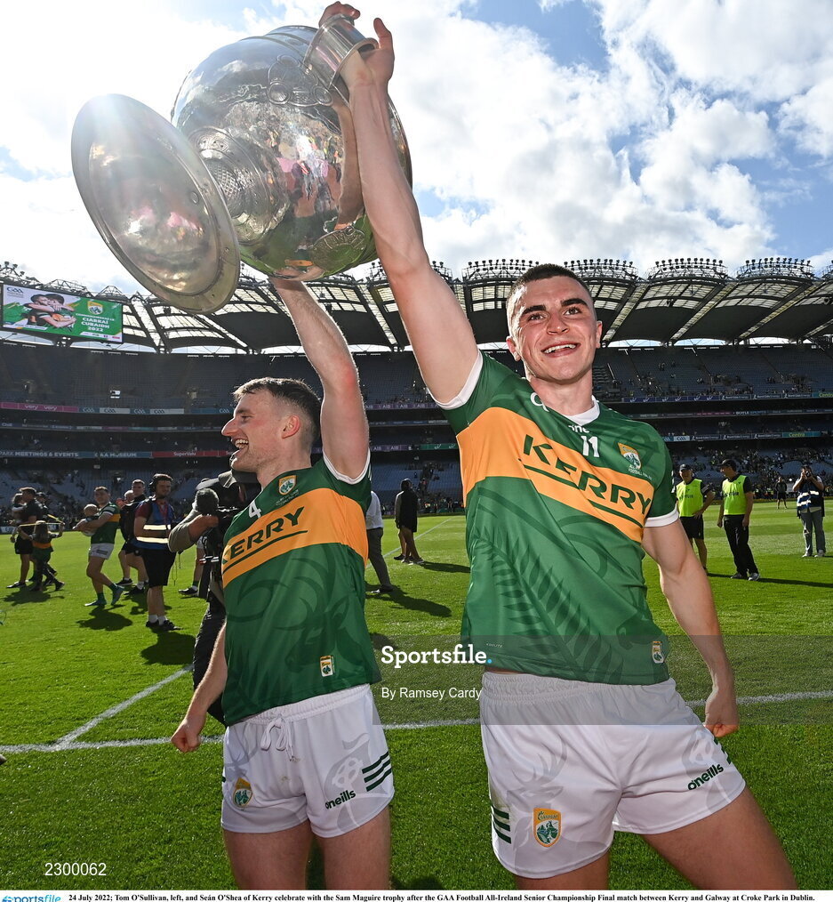 24 July 2022; Tom O'Sullivan, left, and Seán O'Shea of Kerry celebrate with the Sam Maguire trophy after the GAA Football All-Ireland Senior Championship Final match between Kerry and Galway at Croke Park in Dublin. Photo by Ramsey Cardy/Sportsfile