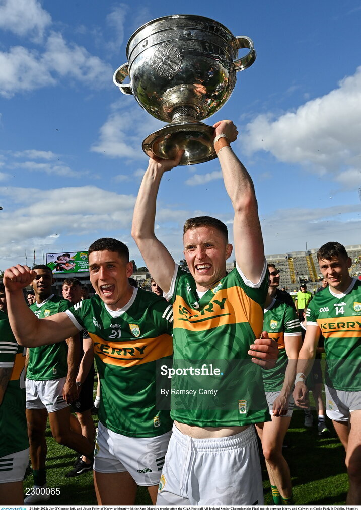 24 July 2022; Joe O'Connor, left, and Jason Foley of Kerry celebrate with the Sam Maguire trophy after the GAA Football All-Ireland Senior Championship Final match between Kerry and Galway at Croke Park in Dublin. Photo by Ramsey Cardy/Sportsfile