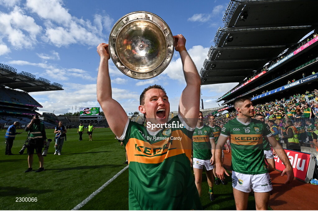 24 July 2022; Tadhg Morley of Kerry celebrates with the Sam Maguire trophy after the GAA Football All-Ireland Senior Championship Final match between Kerry and Galway at Croke Park in Dublin. Photo by Ramsey Cardy/Sportsfile