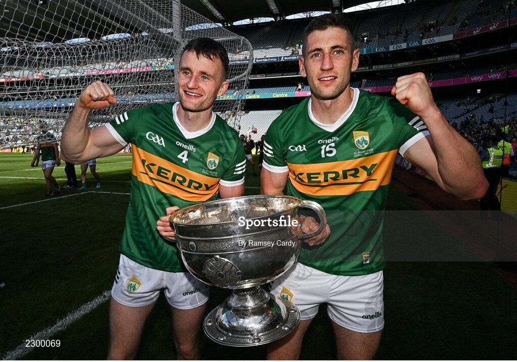 24 July 2022; Tom O'Sullivan, left, and Paul Geaney of Kerry celebrate with the Sam Maguire trophy after the GAA Football All-Ireland Senior Championship Final match between Kerry and Galway at Croke Park in Dublin. Photo by Ramsey Cardy/Sportsfile