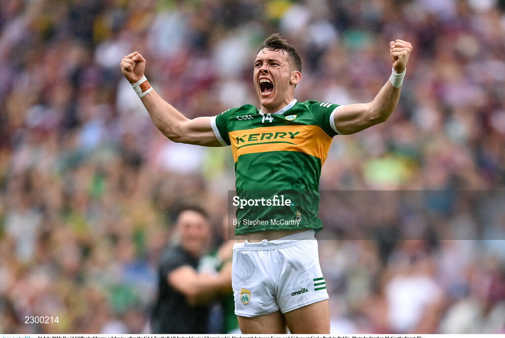 24 July 2022; David Clifford of Kerry celebrates after the GAA Football All-Ireland Senior Championship Final match between Kerry and Galway at Croke Park in Dublin. Photo by Stephen McCarthy/Sportsfile
