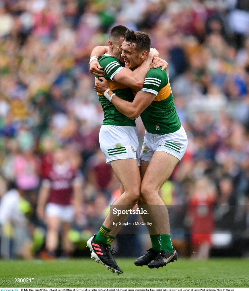 24 July 2022; Seán O'Shea, left, and David Clifford of Kerry celebrate after the GAA Football All-Ireland Senior Championship Final match between Kerry and Galway at Croke Park in Dublin. Photo by Stephen McCarthy/Sportsfile