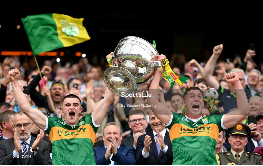 24 July 2022; Kerry captains Seán O'Shea, left, and Joe O'Connor lifts the Sam Maguire cup after the GAA Football All-Ireland Senior Championship Final match between Kerry and Galway at Croke Park in Dublin. Photo by Stephen McCarthy/Sportsfile