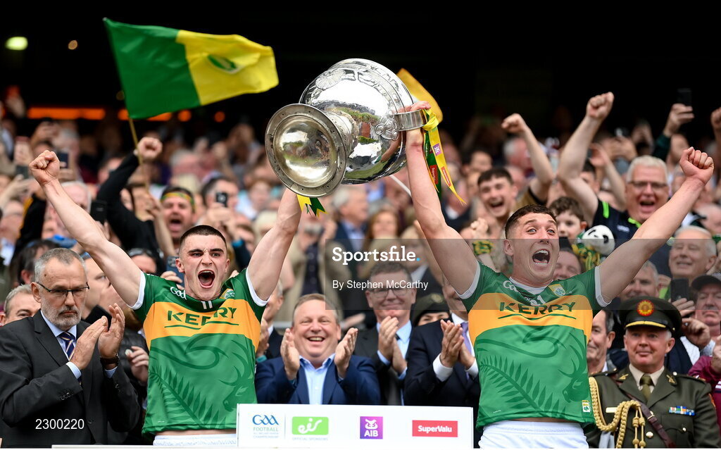 24 July 2022; Kerry captains Seán O'Shea, left, and Joe O'Connor lifts the Sam Maguire cup after the GAA Football All-Ireland Senior Championship Final match between Kerry and Galway at Croke Park in Dublin. Photo by Stephen McCarthy/Sportsfile