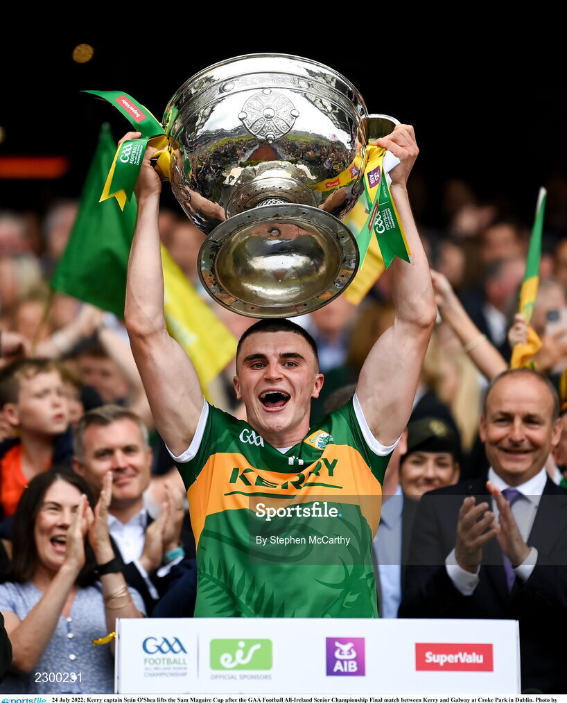 24 July 2022; Kerry captain Seán O'Shea lifts the Sam Maguire Cup after the GAA Football All-Ireland Senior Championship Final match between Kerry and Galway at Croke Park in Dublin. Photo by Stephen McCarthy/Sportsfile