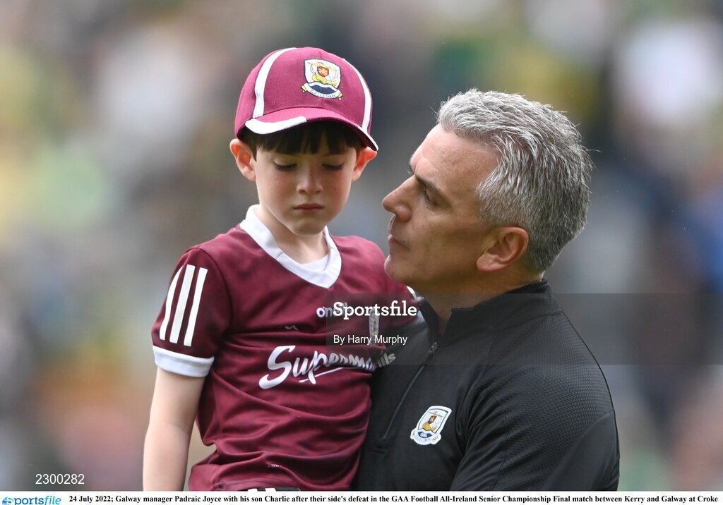 24 July 2022; Galway manager Padraic Joyce with his son Charlie after their side's defeat in the GAA Football All-Ireland Senior Championship Final match between Kerry and Galway at Croke Park in Dublin. Photo by Harry Murphy/Sportsfile