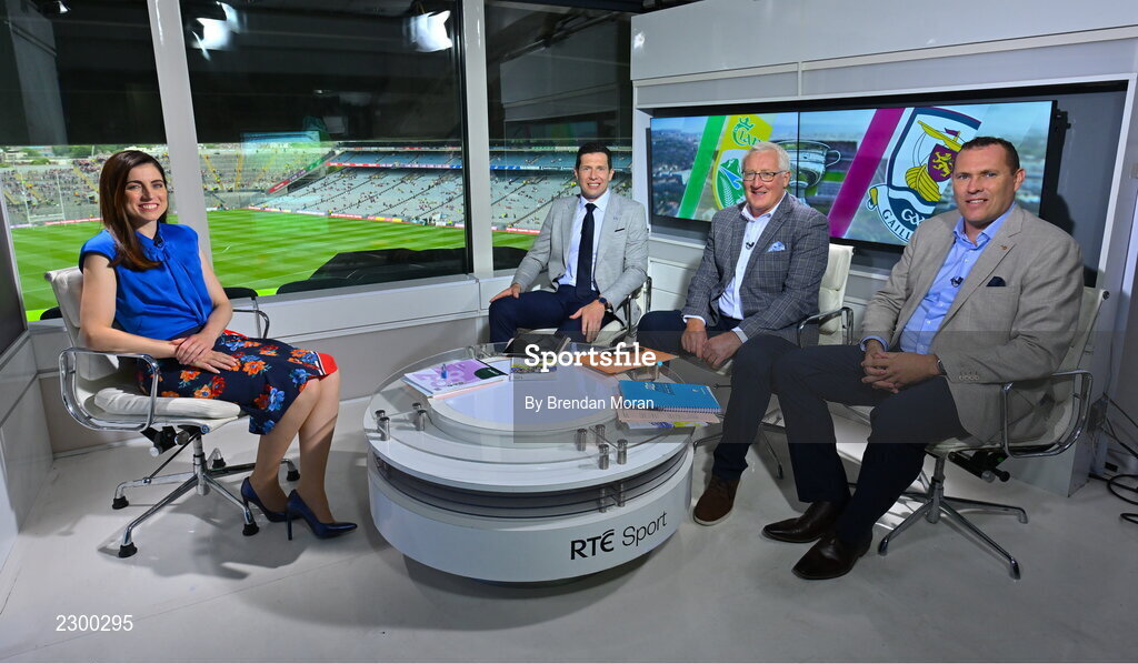 24 July 2022; RTÉ Sunday Game analyst Pat Spillane before his final broadcast, with his Sunday Game colleagues, from left, presenter Joanne Cantwell, analysts Sean Cavanagh and Ciaran Whelan before the GAA Football All-Ireland Senior Championship Final match between Kerry and Galway at Croke Park in Dublin. Photo by Brendan Moran/Sportsfile