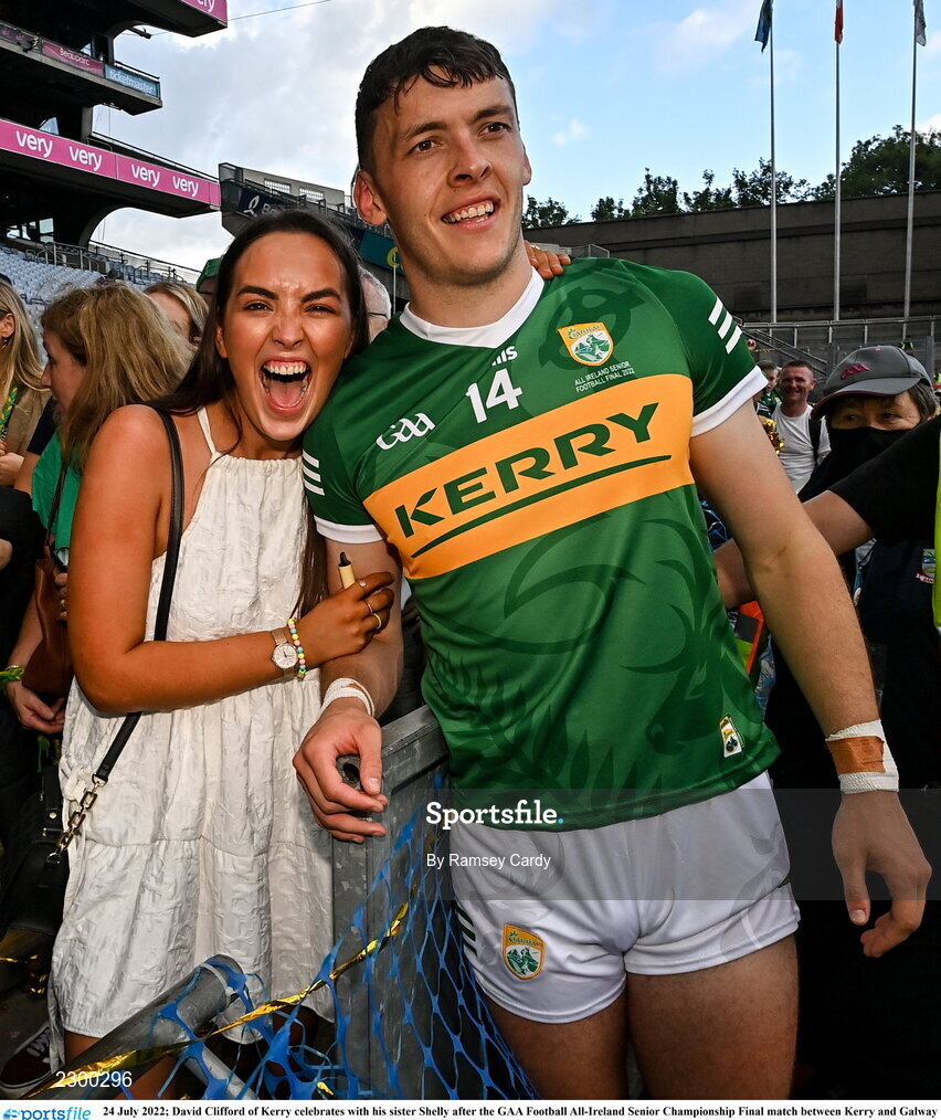 24 July 2022; David Clifford of Kerry celebrates with his sister Shelly after the GAA Football All-Ireland Senior Championship Final match between Kerry and Galway at Croke Park in Dublin. Photo by Ramsey Cardy/Sportsfile