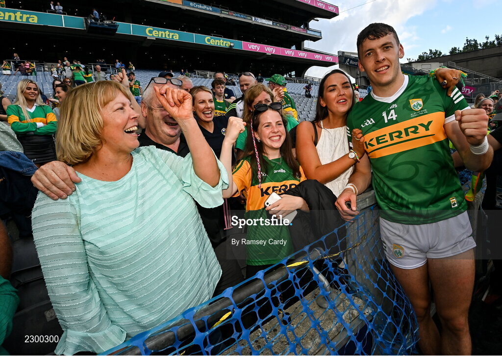 24 July 2022; David Clifford of Kerry with family, including mother Ellen, father Dermot, and sister Shelly, after the GAA Football All-Ireland Senior Championship Final match between Kerry and Galway at Croke Park in Dublin. Photo by Ramsey Cardy/Sportsfile